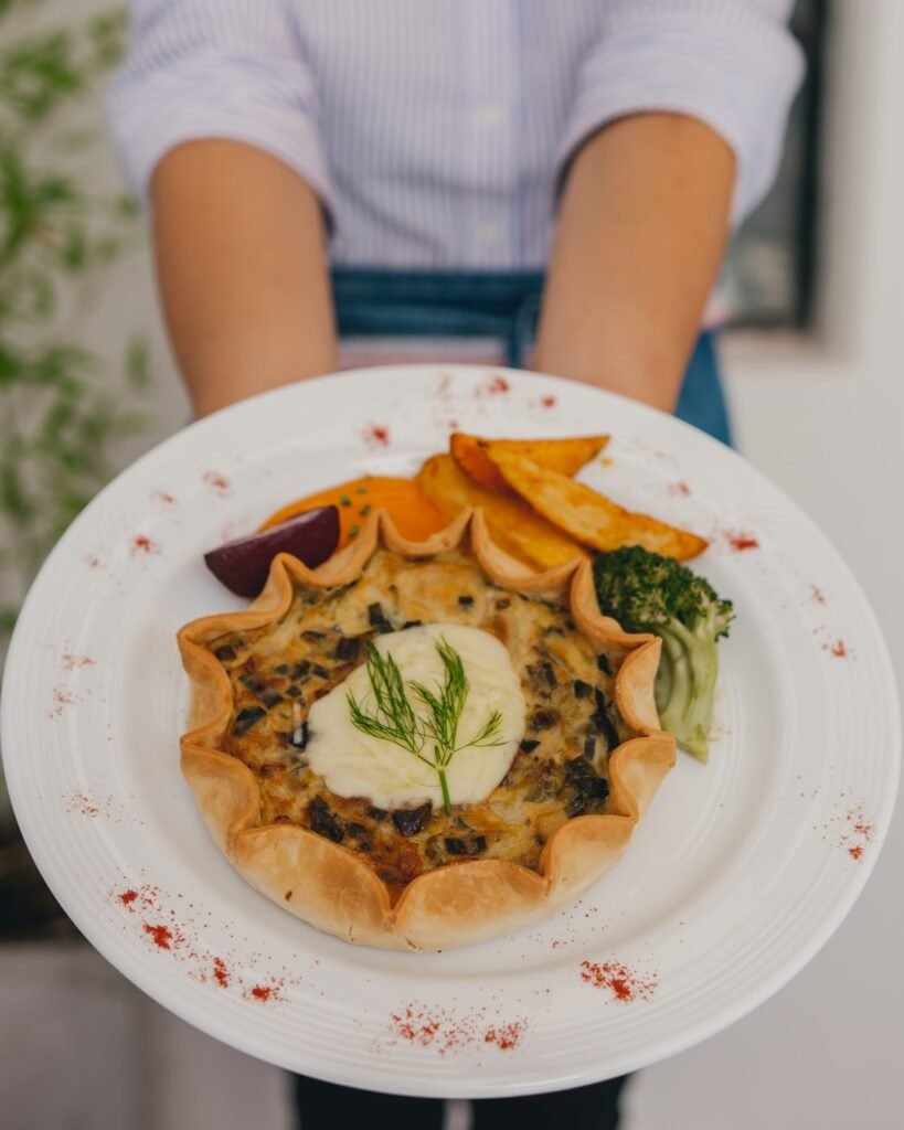 Crocante masa filo rellena de pollo, apio, confit de puerro y manzana verde. Distinto y delicioso.